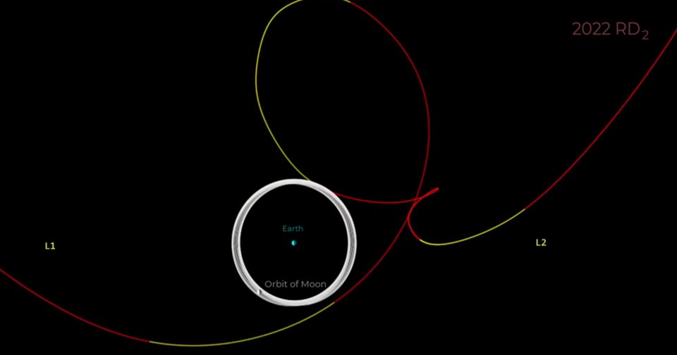 Расчеты показывают, что 2022 RD2 станет временным спутником Земли трижды: с 12 ноября по 12 декабря 2043 года, с 29 февраля по 21 мая 2044 года и с 10 июля по 29 июля 2044 года. После этого его поведение станет нестабильным, и в период с 2080 по 2124 год 2022 RD2 перейдет в статус виртуального ударника для Земли, с вероятностью столкновения с нашей планетой 0,097 процента. Затем астероид покинет ее ближайшие окрестности.
