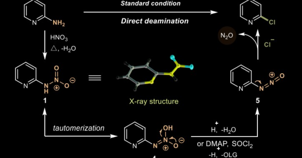 С помощью скрининга разных заместителей и условий реакции ученые выяснили, что аминогруппа, соединенная с нитрогруппой легко покидает ароматическое кольцо в виде оксида азота N2O под действием нуклеофилов, в частности, галогенид-анионов. Так, химикам удалось взять 2-аминопиридин, превратить его в нитрамин под действием азотной кислоты, а его, в свою очередь, превратить в 2-хлорпиридин под действием хлорида магния, хлорида алюминия или тионилхлорида. Такую же реакцию ученые провели с одним килограммом бромзамещенного аминопиридина. В результате с выходом 90 процентов образовалось соответствующее хлорпроизводное.