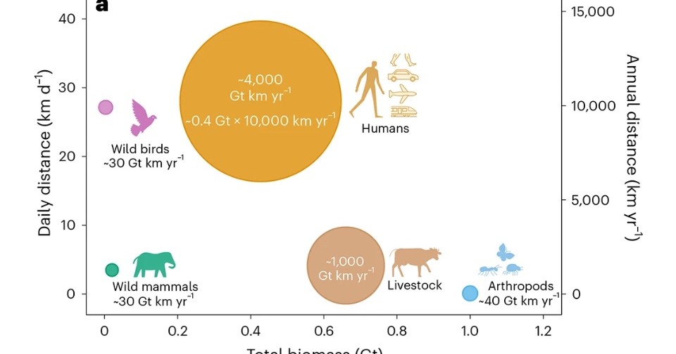 Все люди суммарно за год преодолевают в 40 раз большее расстояние, чем все дикие наземные животные вместе взятые. Каждый человек в среднем за день перемещается более чем на 30 километров, но лишь 10 процентов этого пути он проходит пешком. С 1850 года люди стали мобильнее в 40 раз, но при этом на 60 процентов ограничили перемещения морских животных из-за вылова рыбы и китобойного промысла. Об этом говорится в статье, опубликованной в журнале Nature Ecology & Evolution.