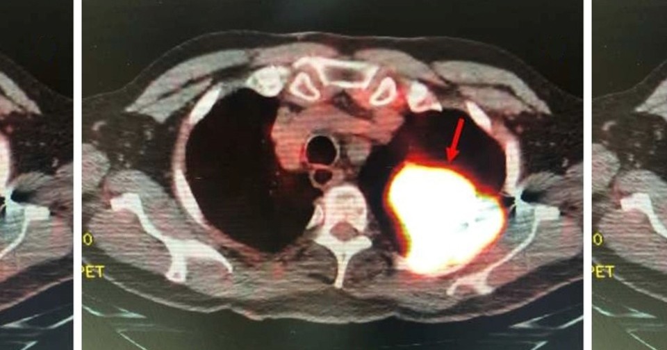 Позитронно-эмиссионная томография выявила изолированное образование в левой верхней доле легкого с локальным поражением грудной стенки без признаков метастазирования. Биопсия легкого подтвердила диагноз мелкоклеточного рака легкого. Врачи удалили пораженную долю легкого вместе с регионарными лимфоузлами.