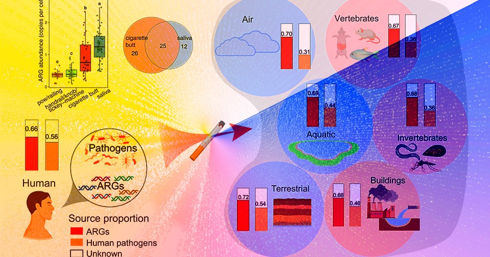 Анализ механизмов пролиферации генов антибиотикоустойчивости в окурках показал, что за нее могут отвечать окислительный стресс под действием токсичных продуктов сгорания табака и других факторов (вероятно, играющий центральную роль), горизонтальный перенос генов и сдвиги в составе микробных сообществ в ходе обмена с окружающей средой. Основными источниками генов антибиотикоустойчивости (66 процентов) и потенциальных патогенов (56 процентов) в окурках были связанные с человеком (в первую очередь слюна, в меньшей степени мостовые, ограды, перила, дверные ручки, торговые автоматы), за остальное отвечали наземные, водные и воздушные экосистемы, позвоночные и беспозвоночные животные. Среди факторов распространения антибиотикоустойчивости социоэкономические (санитария, инфраструктура, озеленение, промышленное производство, образование жителей) преобладали над климатическими, химическими и биологическими.