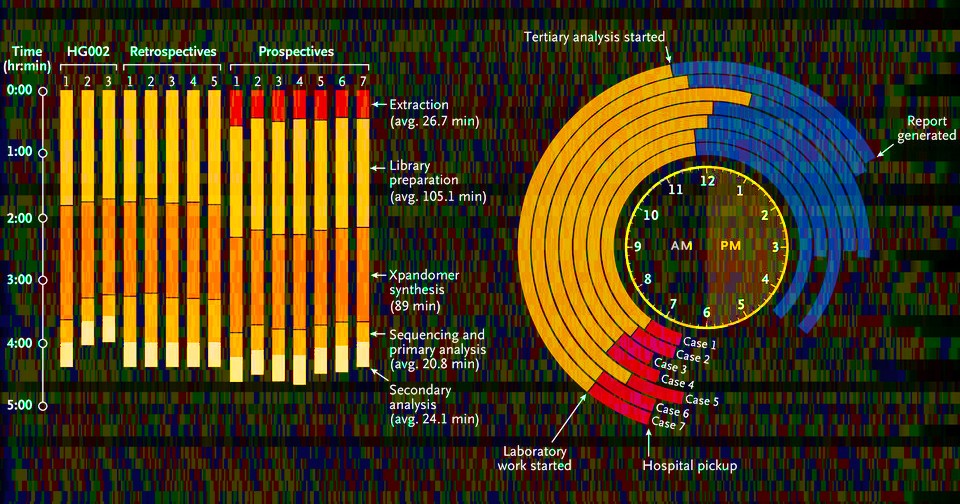Среднее время определения вариантов в геномной ДНК составило 4 часа 4 минуты (от 3 часов 57 минут до 4 часов 25 минут). Если образцы крови поступали в лабораторию к 7:00, заключения с интерпретацией результатов были готовы в тот же день от 14:00 до 16:30, в самом быстром случае — за 6 часов 47 минут. Поскольку прочтение геномов выполнялось в рамках эксперимента, эти заключения не использовали для принятия клинических решений, планы ведения семи текущих пациентов были уже готовы. У пяти из них результаты секвенирования были нормальными, а у двух были обнаружены генетические нарушения: несбалансированная транслокация между 10 и 14 хромосомами, приведшая к многочисленным аномалиям, и патологический вариант гена KCNQ2, который стал причиной тонических судорог. Для обоих пациентов с генетическими дефектами результаты были получены существенно быстрее, чем возможно с помощью имеющихся в практике методов.