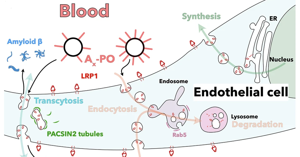 Одной из точек приложения для терапии болезни Альцгеймера мог бы стать гематоэнцефалический барьер, через который выводится бета-амилоид. В нормальных условиях его переносит мембранный белок LRP1, который экспрессируется в эндотелии и связывает патологические белки, выводя их из мозга в кровь. С возрастом (и особенно у пациентов с болезнью Альцгеймера) уровни этого белка в эндотелии многократно снижаются. Кроме того, у больных нарушено сродство белка LRP1 к бета-амилоиду. Если оно избыточно, то бета-амилоид вместе с LRP1 поступает в лизосомы внутри клеток эндотелия, что уменьшает доступность LRP1 для дальнейшего транспорта. Недостаточное сродство делает транспорт бета-амилоида невозможным.