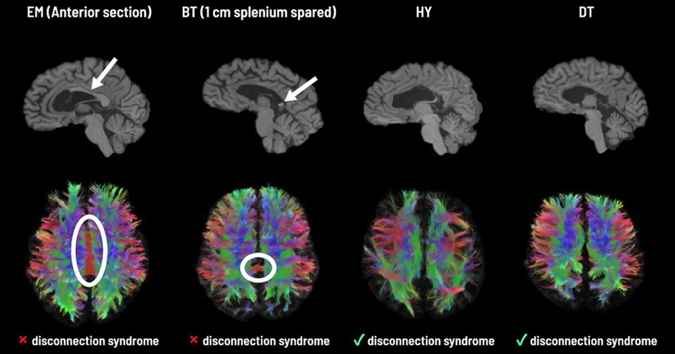 У обоих пациентов с частичным рассечением полушария не были функционально разделены, несмотря на то, что у одного из них сохранился лишь один сантиметр валика мозолистого тела. Результаты их поведенческих тестов и нейровизуализации были сравнимы с нейротипичным контролем. Исследователи пришли к выводу, что небольшого числа волокон мозолистого тела может быть достаточно для функционального соединения двух полушарий. Анализ показал, что у пациента с небольшим количеством сохранных мозолистых путей произошла существенная топологическая реорганизация функциональных сетей. Так, лобные и задние области мозга были связаны друг с другом сильнее, чем у контрольных пациентов. Это, возможно, обеспечивало более оптимальное использование оставшихся мозолистых волокон.