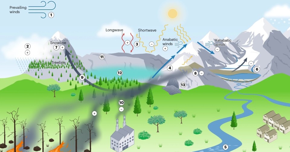 За последние 40 лет горные территории нагрелись сильнее, чем низины, в среднем на 0,084 градуса. В них выпадало в среднем на 4,6 миллиметра меньше осадков, а толщина снежного покрова в них уменьшилась на 10,2 миллиметра. До конца века эта тенденция будет сохраняться: потепление в горах будет происходить на 0,13 градуса в 100 лет быстрее, чем среднем по планете. Так происходит из-за таяния снежного покрова в горах, которое ведет к понижению альбедо и снижению количества осадков, питающих ледники — а значит, страдают и истоки рек, от которых зависит жизнь миллиарда человек. Об этом говорится в статье, опубликованной в журнале Nature Reviews Earth & Environment.