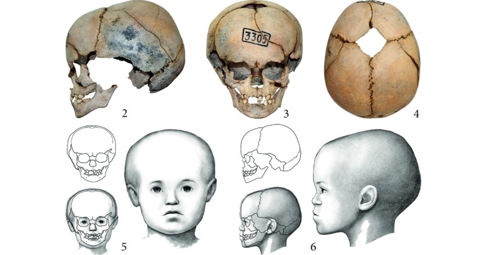 Антропологи, которые исследовали раскопанные останки, определили, что они принадлежали ребенку (возможно, мальчику), прожившему, по-видимому, около 24 ± 8 месяцев. При нормальном размере лицевого отдела черепа ребенок выделялся открытым крупным родничком и большой черепной коробкой, указывающей на то, что у него была макроцефалия. По мнению ученых, к макроцефалии привела водянка головного мозга (гидроцефалия), то есть повышенное скопление цереброспинальной жидкости в желудочках головного мозга и ликворосодержащих пространствах. Вполне вероятно, что именно с этой необычной патологией связан нетипичный погребальный обряд.